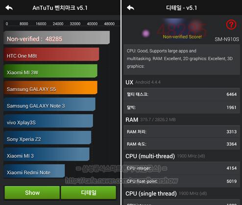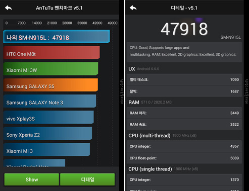The Samsung N915L, aka Galaxy Note Edge with Exynos, scored just under 48,000 points while the Samsung N910S, aka Galaxy Note 4 with Snapdragon, got just over 48,000 points. The benchmark seems to show negligible difference in multi-core performance and RAM speed. The multi-core result is interesting because the Exynos 5433 is SMP-enabled meaning it can run all eight cores simultaneously, even if they are at a lower clockspeed than the four Krait 450 cores in the Snapdragon 805.