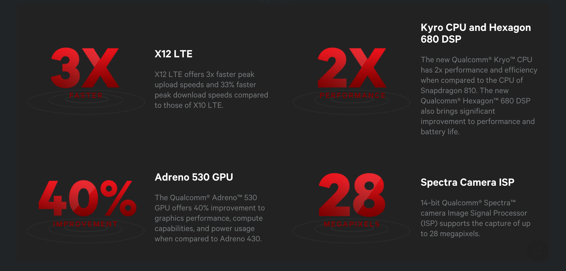 In terms of graphics the Adreno 530 GPU is used with the Snapdragon 820. It’s said to come with a 40% improvement to graphics performance, compute capabilities, and power usage when compared to the Adreno 430 from the Snapdragon 810.